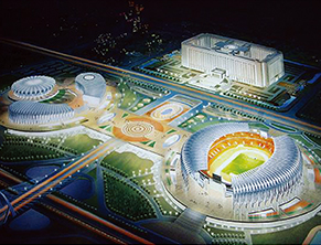 濟南奧林匹克體育中心坐落于濟南東部新城,北起經十路,南至龍奧北路,東起奧體東路,西至奧體西路,占地81公頃(1215畝),建筑面積35萬㎡,總投資概算約50億元。包括6萬座席體育場、1萬座席體育館、4000座席網球館、4000座席游泳館以及6萬平方米中心區平臺廣場。